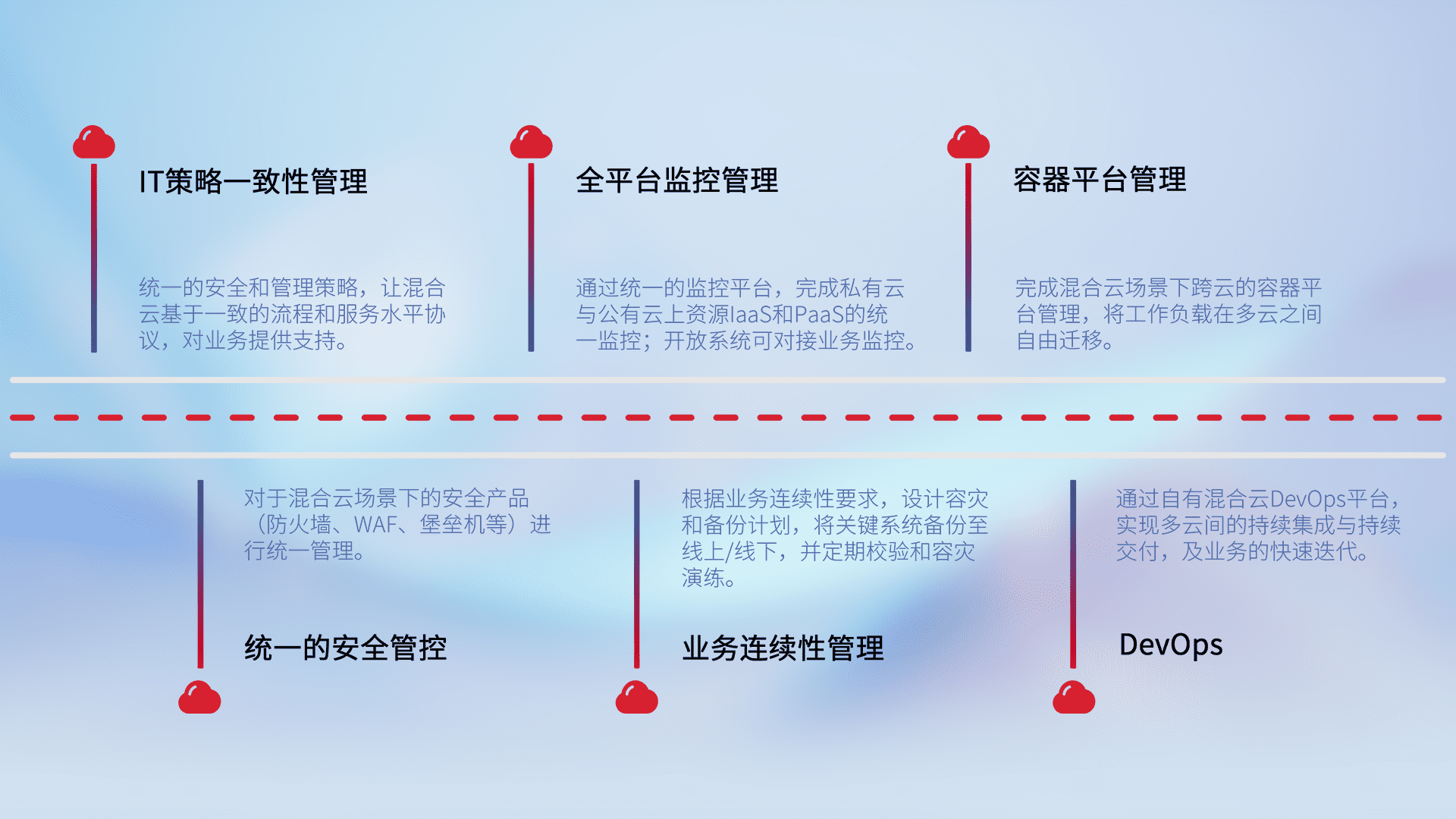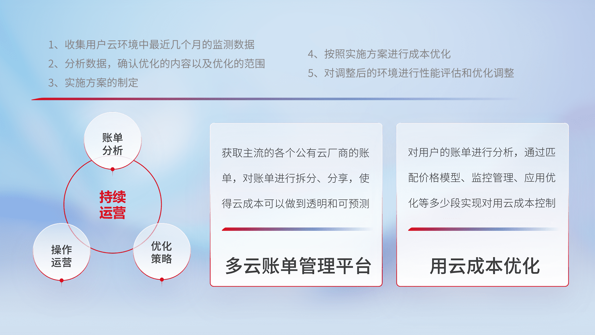 通过多云纳管,,,以统一的资源数据模型把客户的云资源进行抽象和封装,,,进而实现对多云资源的统一操作,,,保障云资源管理的可靠性、、、稳定性与可用性。。。量身定制化运维内容,,,,配置、、开发运维、、、补丁管理、、备份、、、、监控、、认证和访问管理、、、审计和日常巡检等,,保障在用云过程中的可靠度,,,,稳定度以及高可用率。。。